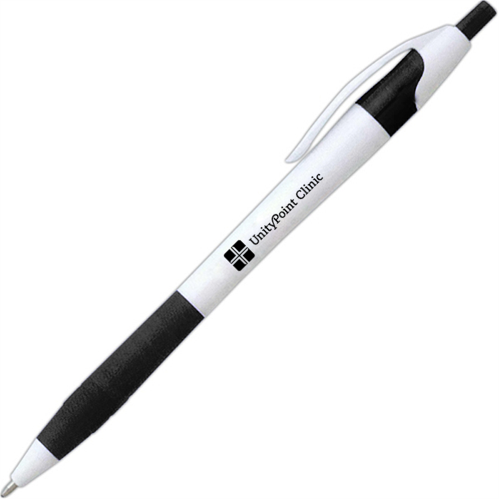 White ballpoint pen with rubber grip and accents. Available with the clinic logo imprinted in black on the side of the barrel.