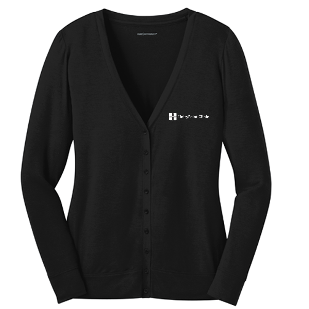 cuffs for a streamlined look with an open Y-neck and 9-button cardigan placket. Available in Ladies' sizes XS-4XL in your choice of Black, Grey or Moonlight Blue with the Unity Point logo embroidered on the left chest.