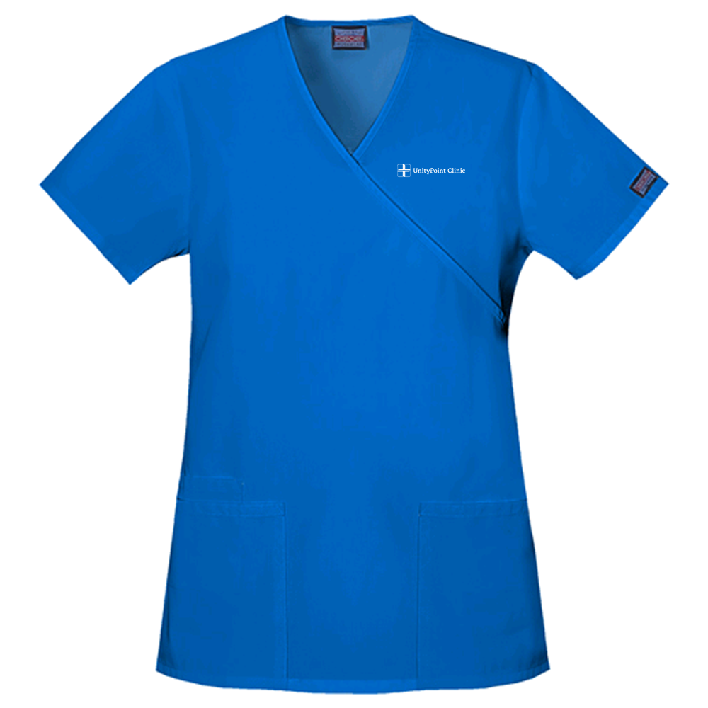This mock wrap tunic features two patch pockets, one cell phone pocket,