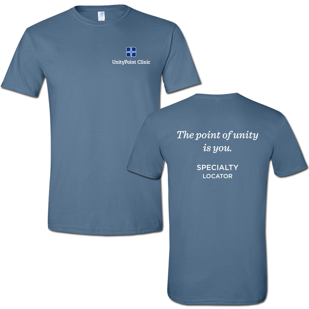 This preshrunk 4.5-ounce, 100% cotton T-shirt features a seamless double-needle 3/4" rib knit collar, taped neck with rolled forward shoulders for better fit, and double-needle sleeves and hem. Available in Indigo Blue in sizes S-2XL, this shirt come with a screen printed Unity Point Logo on the left chest and "The point of unity is you." and your Specialty Locator across the back.