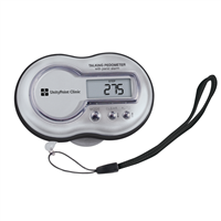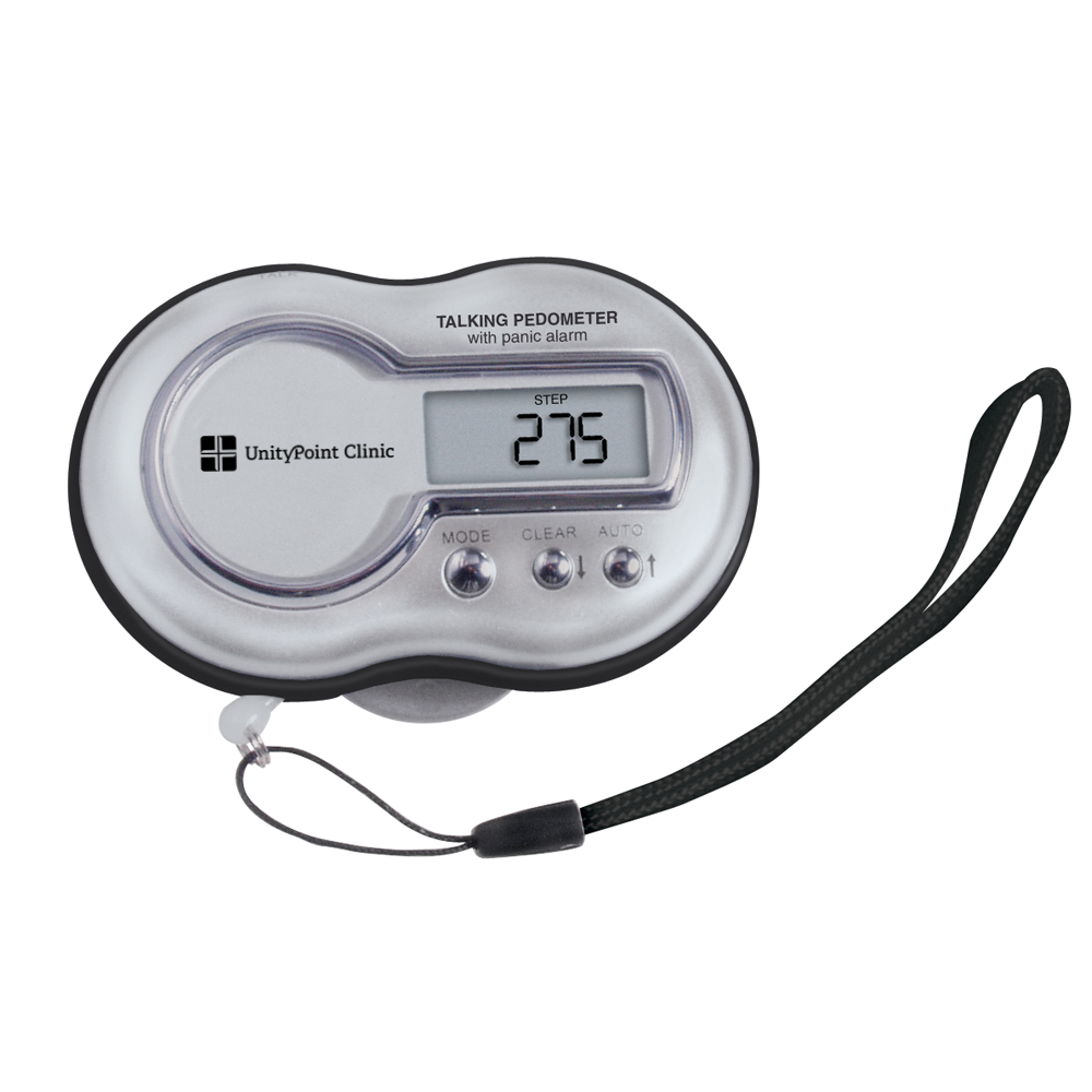 This "talking" pedometer measures steps taken (up to 99999), calories