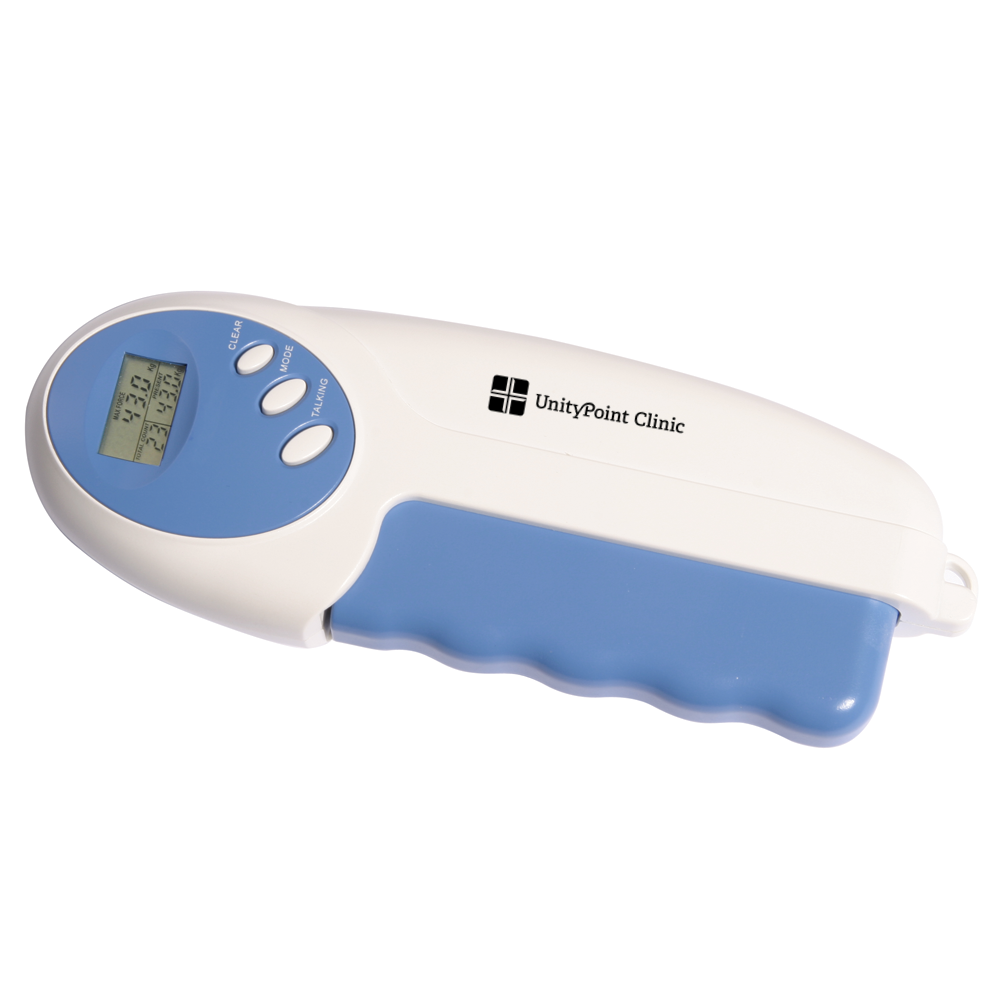 calories burned. Available in white with a blue handle with the Unity Point logo imprinted in black on the handle. Operates on two AAA batteries