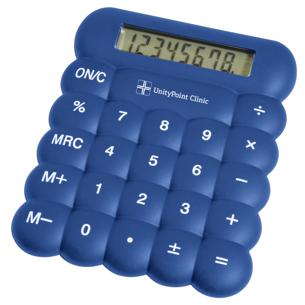 The "Original" silicone bubble calculators feature raised "pillow" keys that bring a new standard of comfort and ergonomic design to your computations. Large 8-digit LCD display features magnifier window and automatically turns off when not in use to preserve battery life. Performs all standard operations with memory function. Operates on one button cell battery (LR1130) included. The Unity Point logo is imprinted in white below the display.