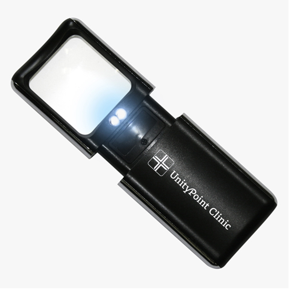 maps. Black case with silver trim and the Unity Point logo imprinted in white. Operates on two button cell batteries (LR1130) included. Gift boxed.